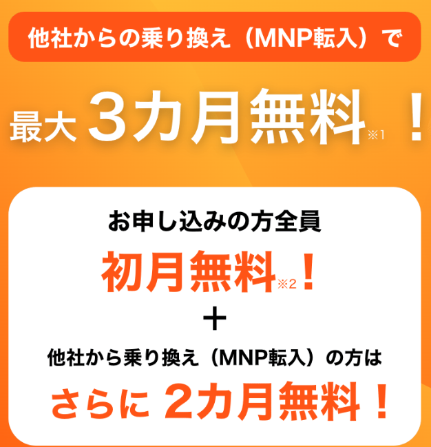 - 特典①:MNP(乗り換え)なら最大3ヶ月間無料! 通常月額2,970円(税込)のプランが、3ヶ月間タダ。これだけで約9,000円分の節約になります。(※新規契約でも初月無料)